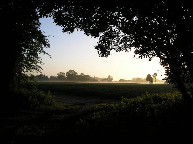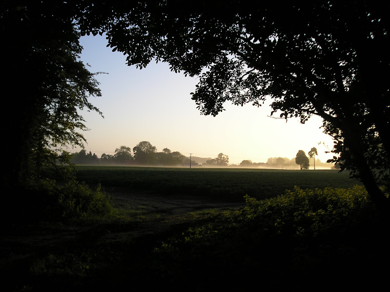 A mist hovered above the fields which presented a magical scene one could only stand and gaze at in wonder. The track from the woods leads into Herringswell and the Icknield Way then continues onto the village of Tuddenham. There was a half hope that maybe a newsagent would be encountered at Tuddenham where I could buy some water, but no such luck. A small terrier type dog gave chase to me as I headed out of the village down the lane towards Icklingham. Yapping and snapping like little dogs do. The lane out of Tuddenham is a long straight single track leading through to the River Lark then on into the village. From the map it appears that there should be a bridge across the river but as I came closer there was no sign of a bridge and thoughts crossed my mind of having to swim or wade across the water. The expected location of the bridge revealed nothing but a single large pipe spanning the river below. Probably a water or gas main. The sight was disheartening. The track led around to the left, following the river up stream. Then there, a few yards onwards was a simple footbridge. A relief!