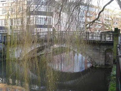 The current pedestrian bridge here was built by James Frost in 1804, replacing an earlier stone bridge, and is the earliest iron bridge in Norwich and stands next to the 1773 former Anchor Brewery buildings of Bullard and Sons, now converted to flats.