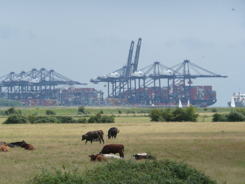 The second half of this walks starts with a ramble through the Cliff Plantation, an area of woodland along the cliffside of the estuary. This is followed by a lengthy hike along the riverside marshes and defence banks. This provides great views across the estuary where the eye is caught by the regular passing of river craft. The riverside marsh is full mud bank formations which entice the birdlife to scavenge on the revealed mud as the tide ebbs. There is always something to see, something to catch ones eye. As the course of the river turns, Felixstowe docks comes fully into full view, dominating the horizon with its huge cranes and container ships, dwarfing the nature below. Then as the path draws level with this 20th century monument to global trade, Shotley Marina reveals itself, full of luxury yachts, their tall masts standing and clattering in the breezes.
